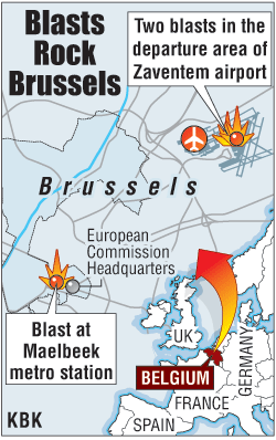 1:40 p.m. IST -- Some reports say the explosions took place near the American Airlines desk at the Brussels airport.