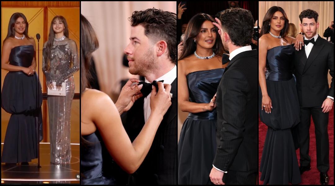 Priyanka and Nick Jonas arrived together in Los Angeles and stole the moment with their romantic PDA. The couple began posing together, all smiles. At one point, Priyanka Chopra was seen fixing Jonas's bow tie, while Nick lovingly adjusted Priyanka's hair.